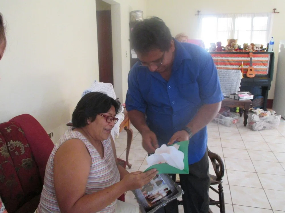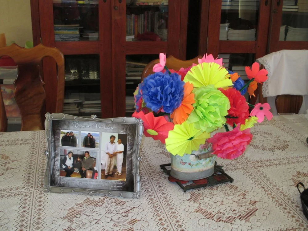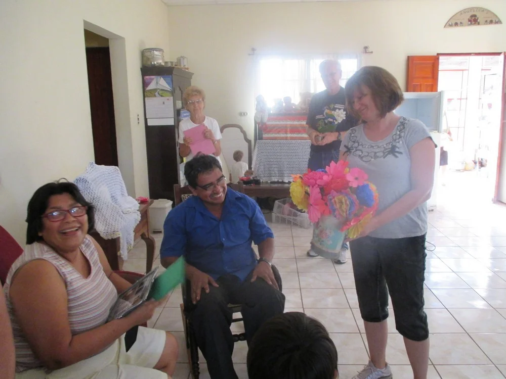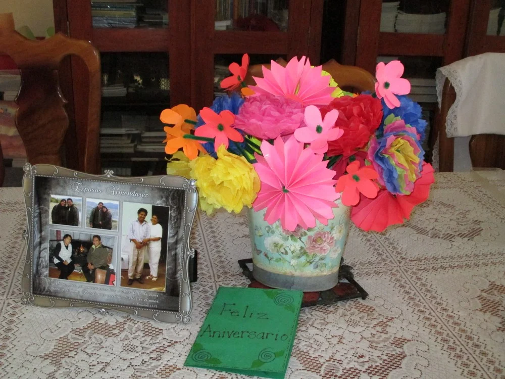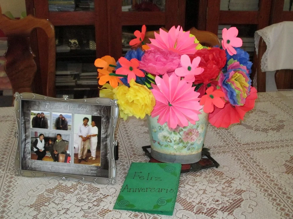 My friend Gwen who went on the trip is talented beyond my imagination and designed a paper bouquet of flowers and a card for them. We also gave them a photo of themselves that was taken many years ago.